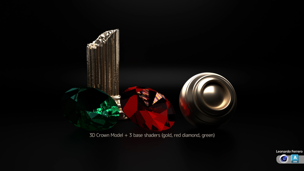 Captivating 3D crowns designed by Leonardo Ferrero. ✨ Elevate your projects with these stunning gold, red diamond, and green shaders. Perfect for graphic design, illustration, and 3D typography. #DigitalArt #3DRendering #Cinema4D