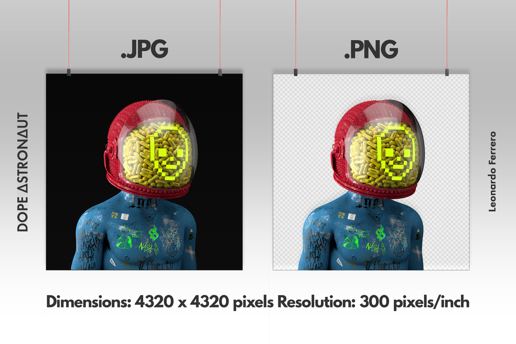 Description: Immerse yourself in the captivating urban narrative of 'Dope Astronaut 0033,' a digital masterpiece crafted by the renowned artist Leonardo Ferrero. This artwork poses the question: Are the pills our salvation or our destruction? Have you taken your pill today?